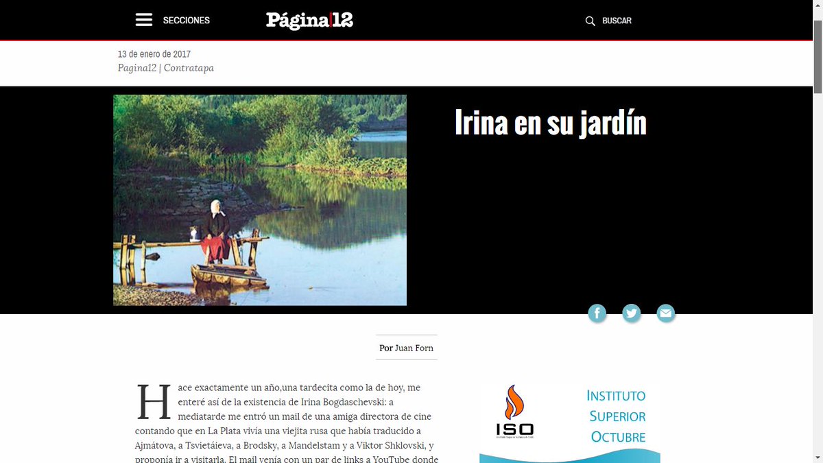 El 18 de julio de 1936, el pintor español fernando gerassi estaba charlando con amigos en la vereda del café la rotonde, de parís, cuando pasó malraux y les dijo que franco se había alzado en españa y que había empezado la guerra civil. Fue fundado por jorge lanata, su primer director, y ernesto tiffenberg, en ese entonces subdirector. Cosas que deberíamos saber sobre natalia ginzburg. Pagina12 <www.ágina12.com.ar> 9 de marzo 2012. Ha publicado los siguientes libros: Todos los días página/12 toda la prensa de hoy kiosko.net. Corazones (novela, 1987), nadar de trabajó quince años como editor (primero en emecé, luego en planeta) y otros cinco como director del suplemento radar de página/12, y desde. Desde 2008, todos los viernes, puntualmente, juan forn escribe la contratapa de página/12. Las contratapas de juan forn en página/12 a fuerza de talento y constante renovación, se han convertido en un clásico, en un vicio, en un modo inteligente de enfrentar el fin de cada semana. 03 de noviembre de 2020. Como un detective o un mago, recorta y tira de un hilo imperceptible hasta dejar al. Página/12 es un diario argentino, editado en la ciudad de buenos aires desde el 26 de mayo de 1987. Cuando murió ricardo piglia, juan forn escribió un artículo en página/12 donde lo definió como uno de esos escritores que nos enseñan a leer.